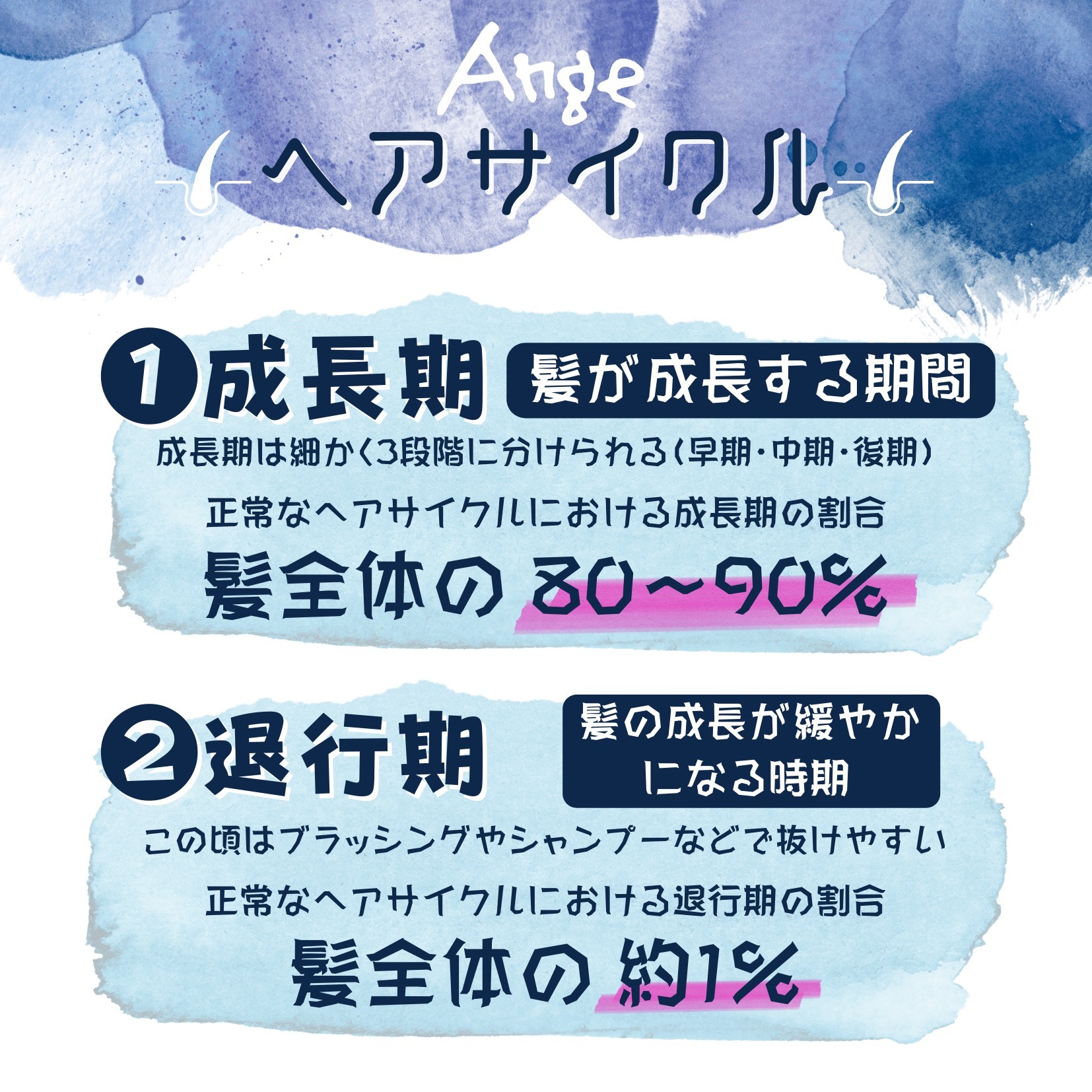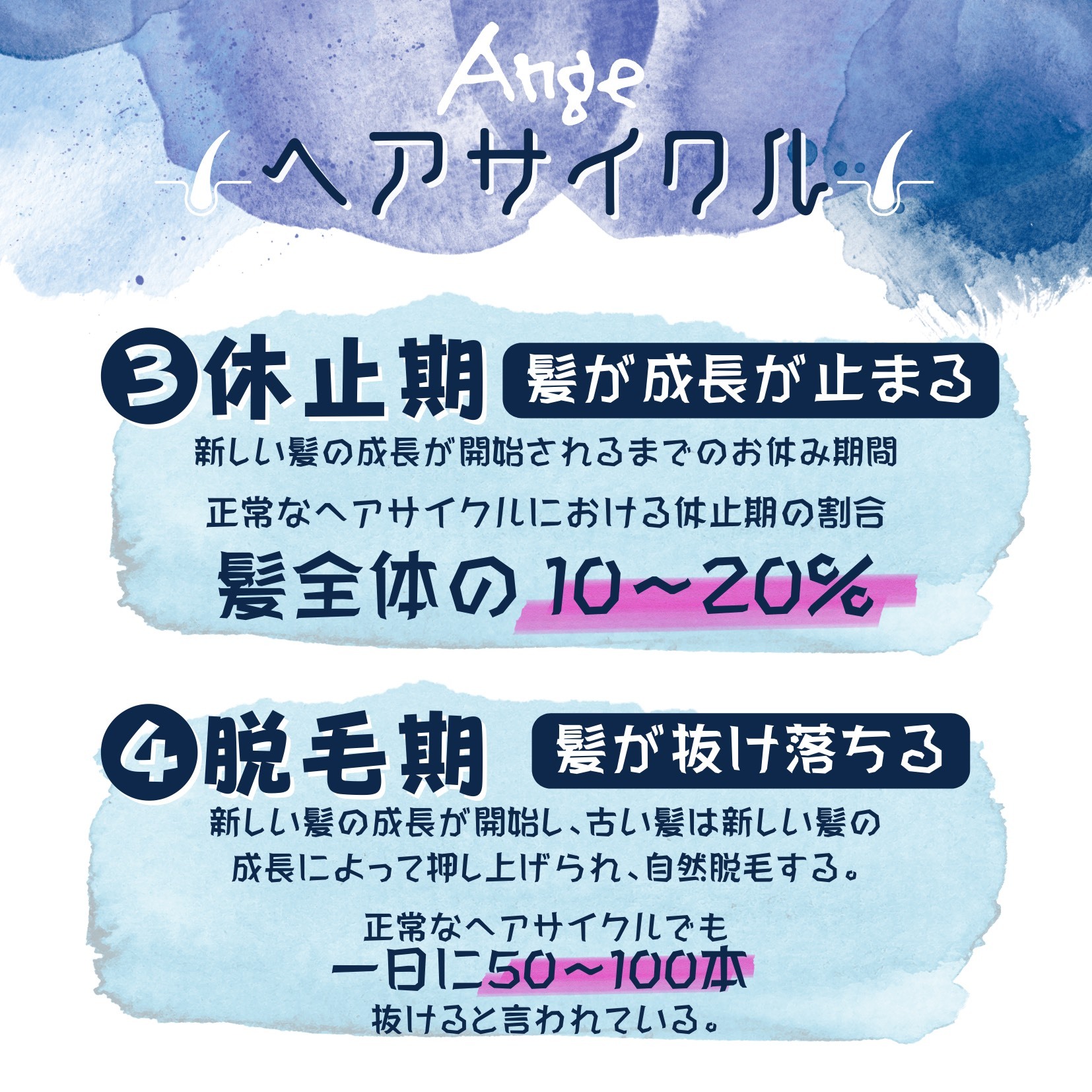 休止期や退行期には、髪は浅いところにあるためブラッシングやシャンプーなどで簡単に抜け落ちます。一日あたり50~100本程度抜けていくのは自然な生理現象なので心配する必要はありません♪
